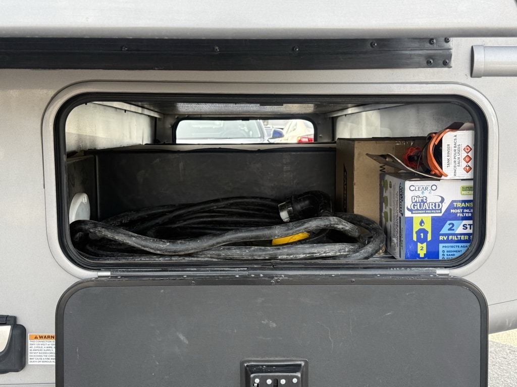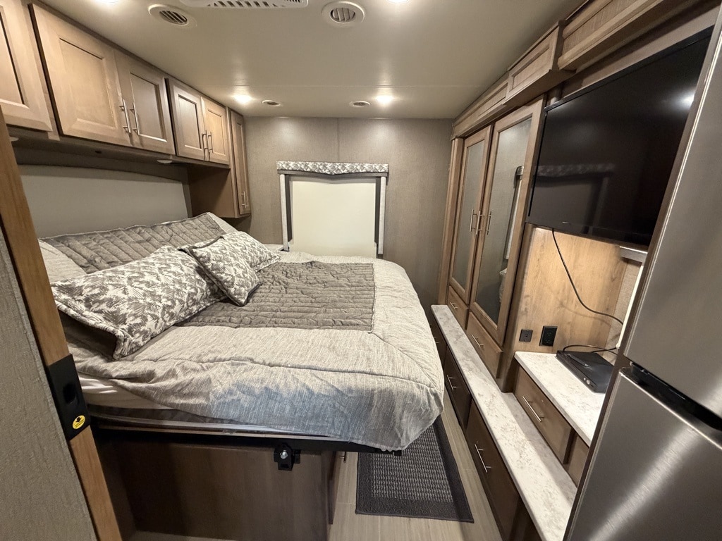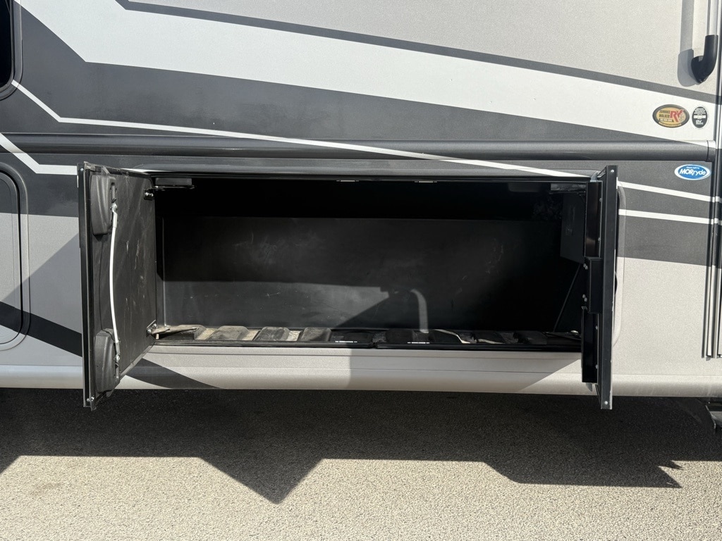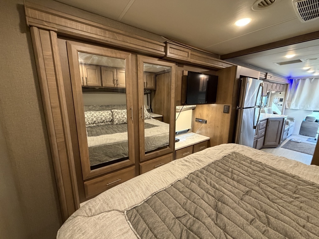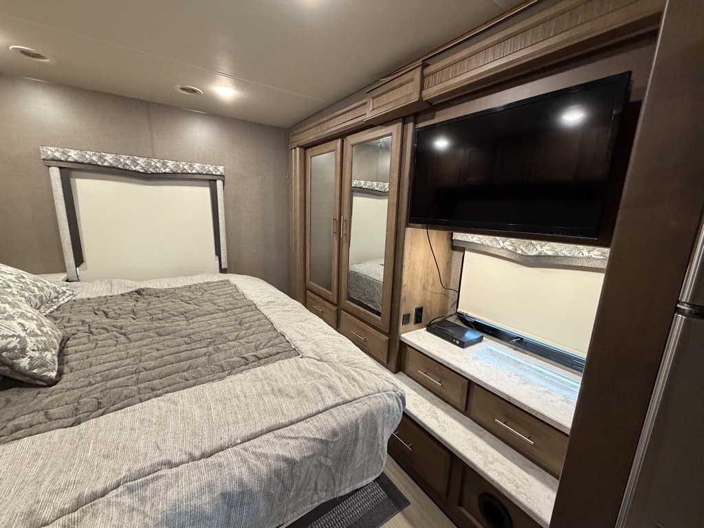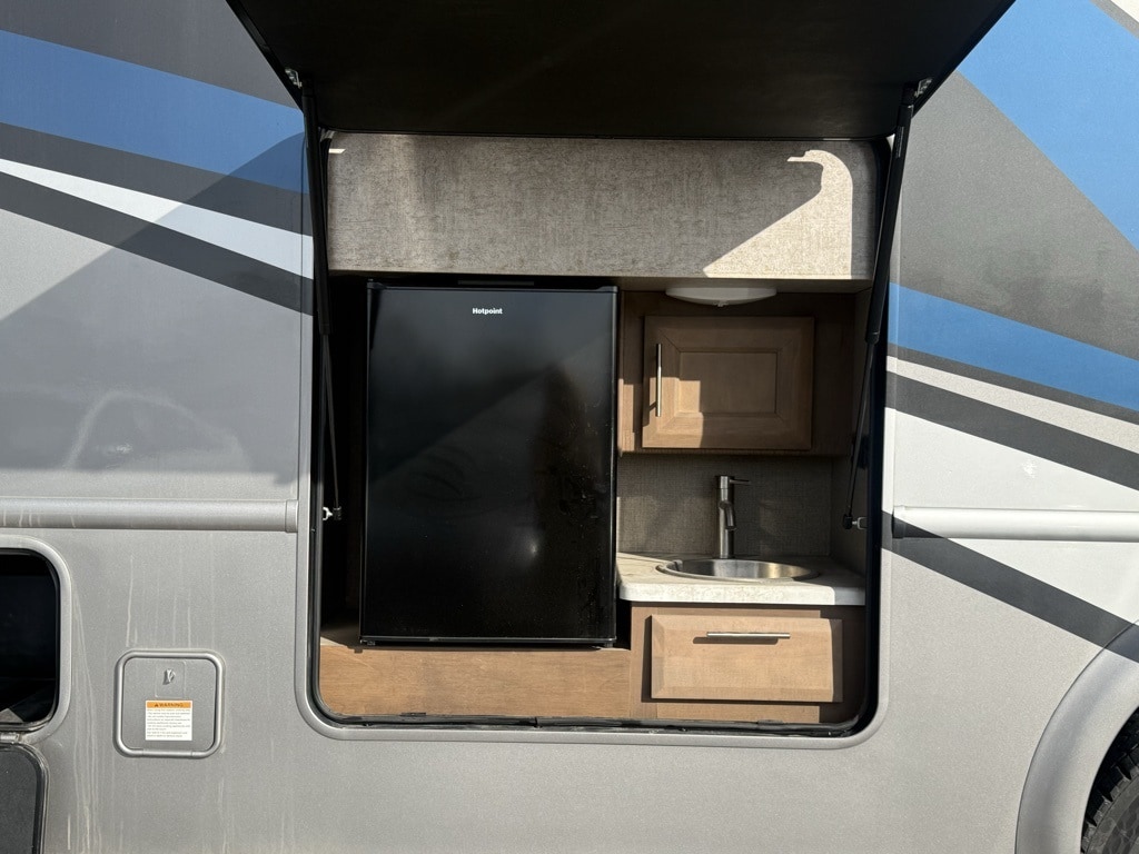 Outdoor Amenities: Includes an exterior kitchen (2.5 cu. ft. fridge and sink), a 32" LED TV on a swivel bracket, and a 20-foot power awning with LED lighting.