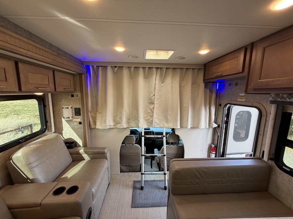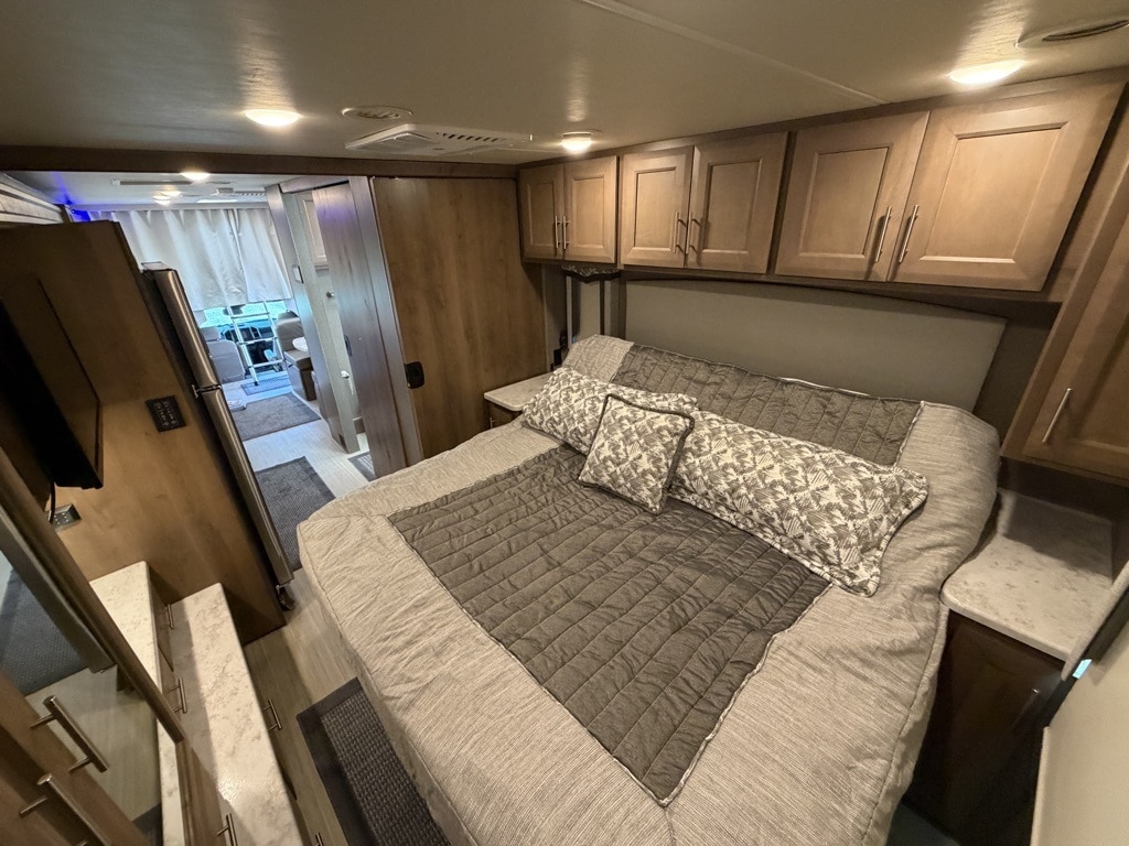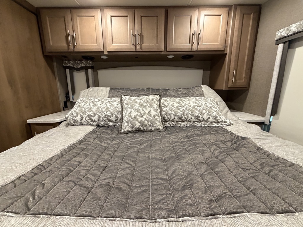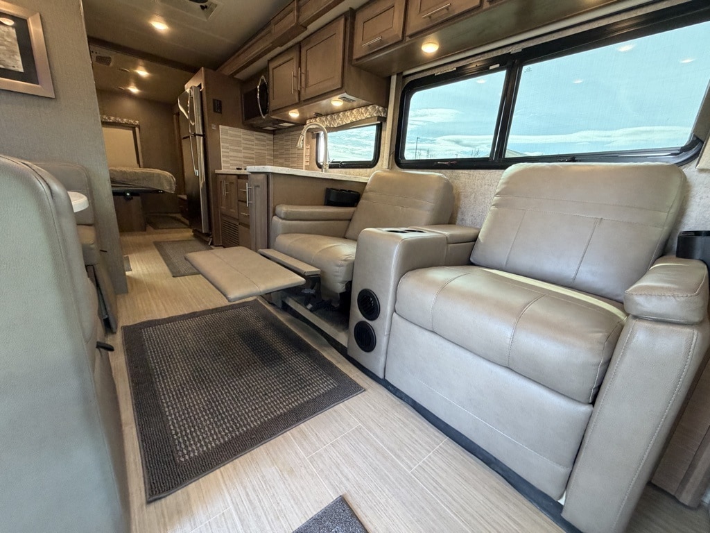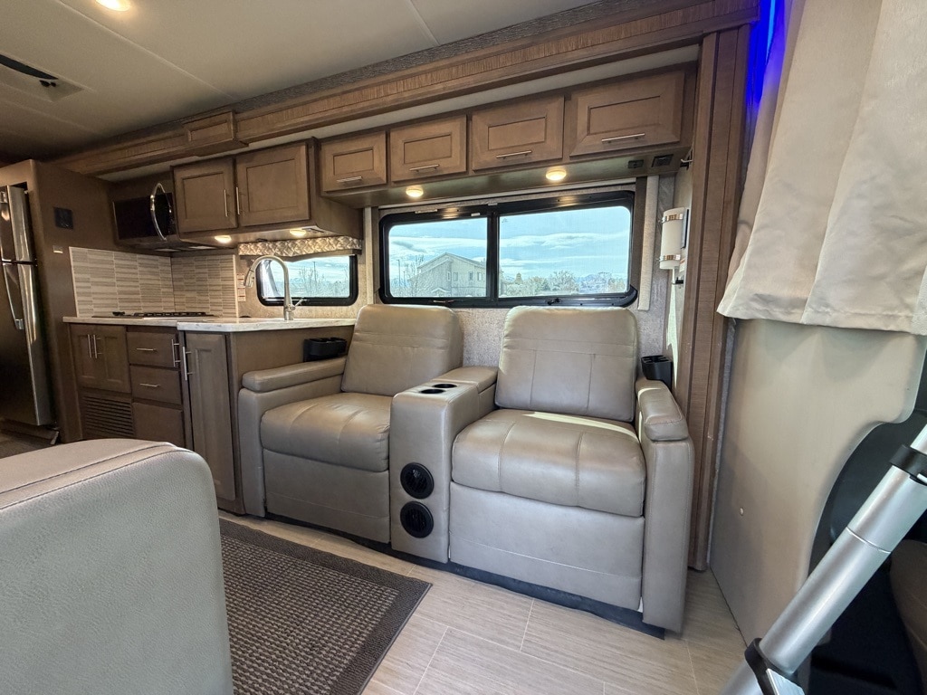 Sleeping Capacity: It can sleep 7 to 8 people, utilizing a King-size Tilt-A-View inclining bed, a cab-over bunk, and leatherette theater seating reclining chairs