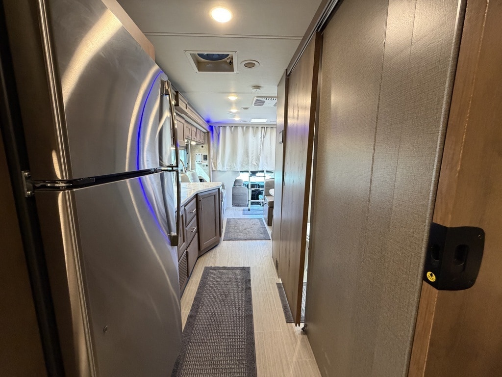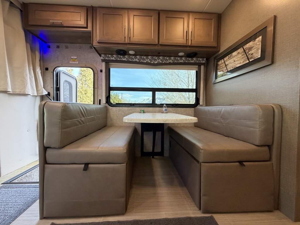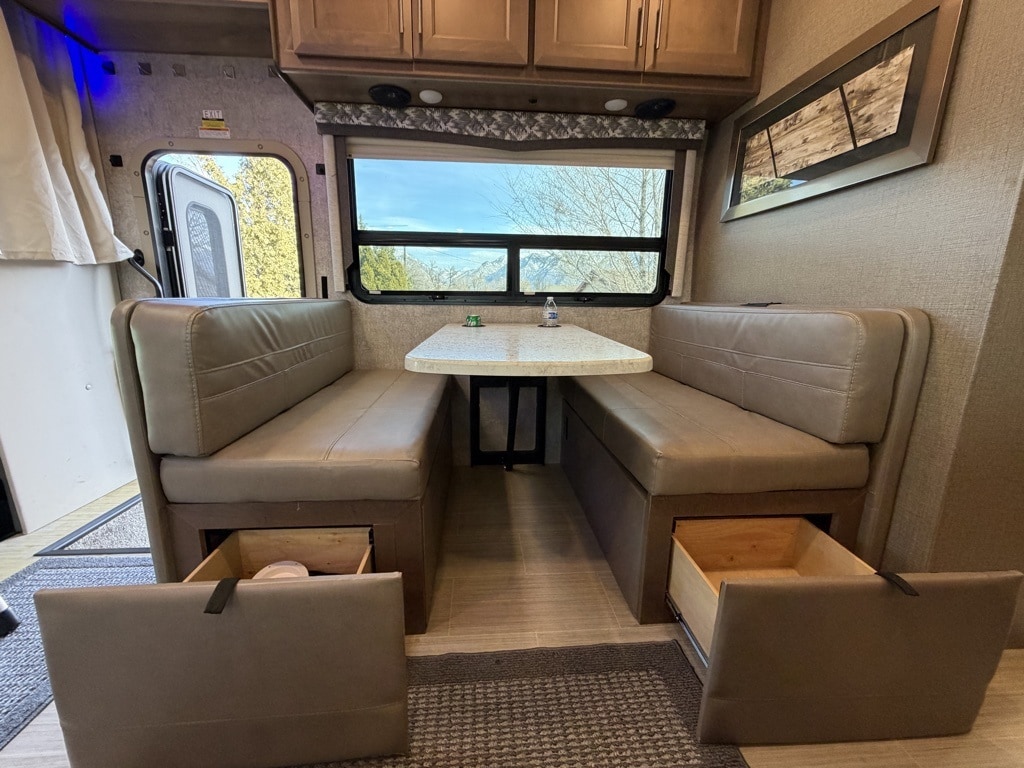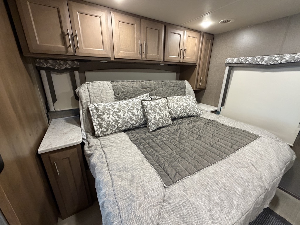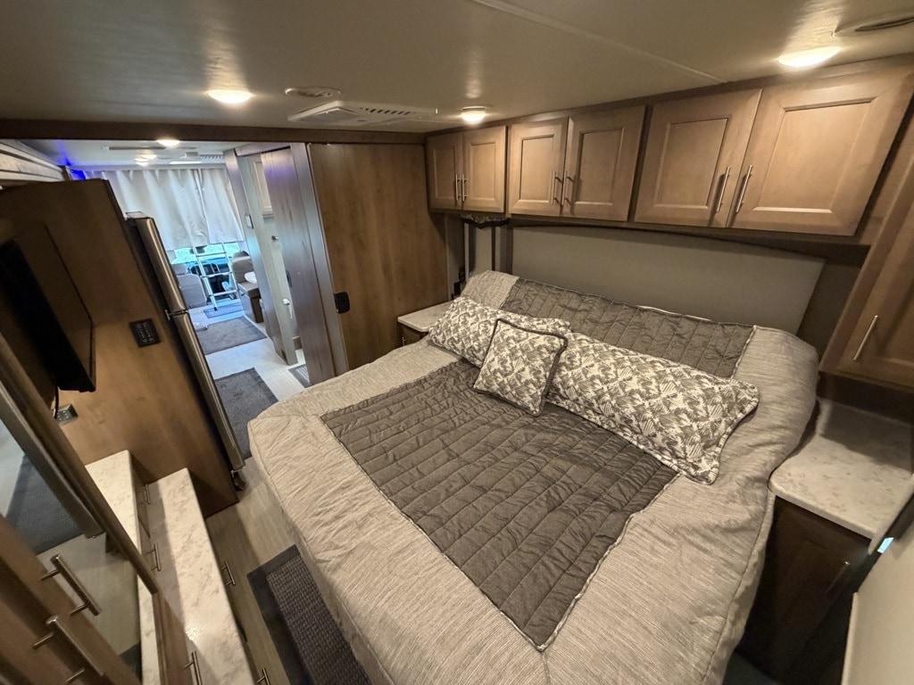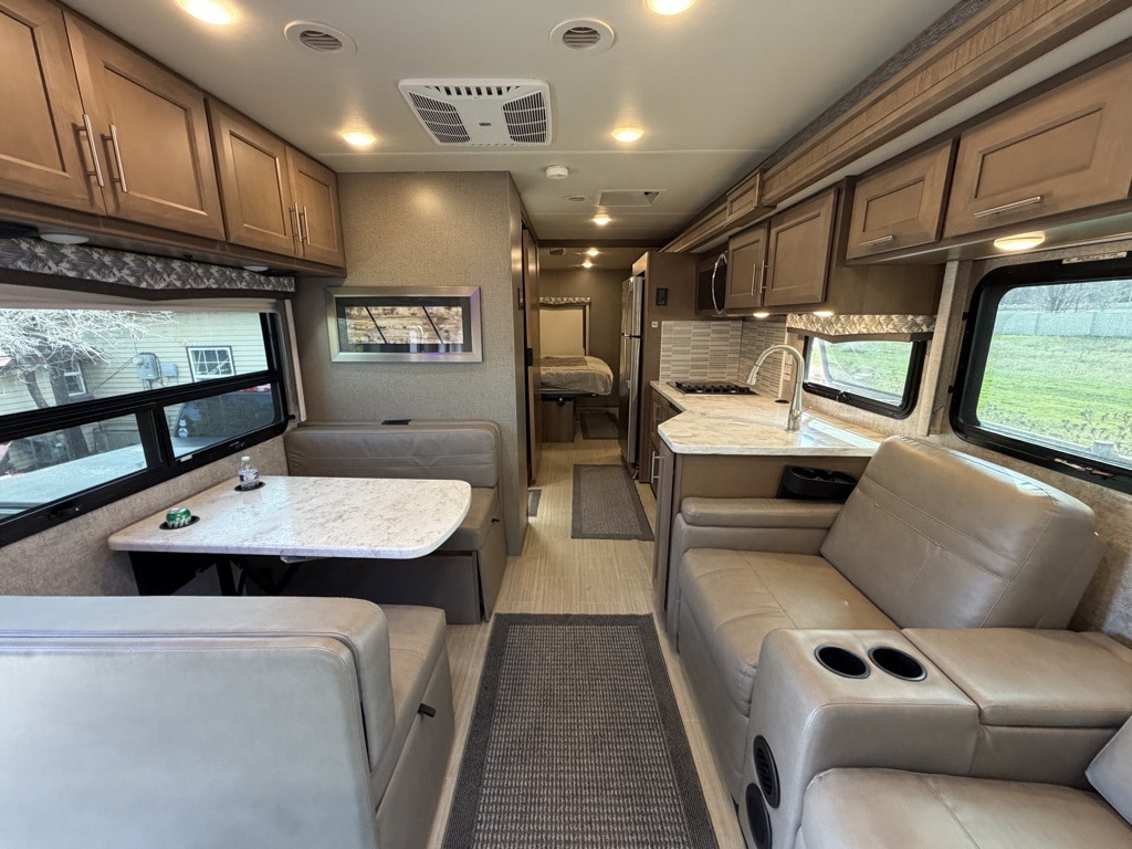 Sleeping Capacity: It can sleep 7 to 8 people, utilizing a King-size Tilt-A-View inclining bed, a cab-over bunk, and leatherette theater seating reclining chairs