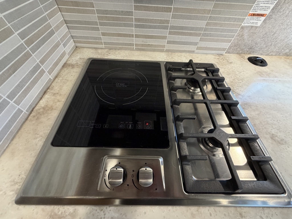 Kitchen: High-end residential-style features including a 16 cu. ft. stainless steel refrigerator with icemaker, a 2-burner gas range with a single induction cooktop, and solid surface countertops.